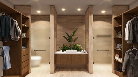 * Carpintería natural Encino en cocina, vestidores y puertas.