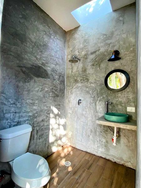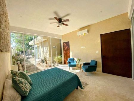 --Habitación principal con baño completo, closet vestidor, dos jardines interiores, vista a la terraza, aire acondicionado y ventilador.