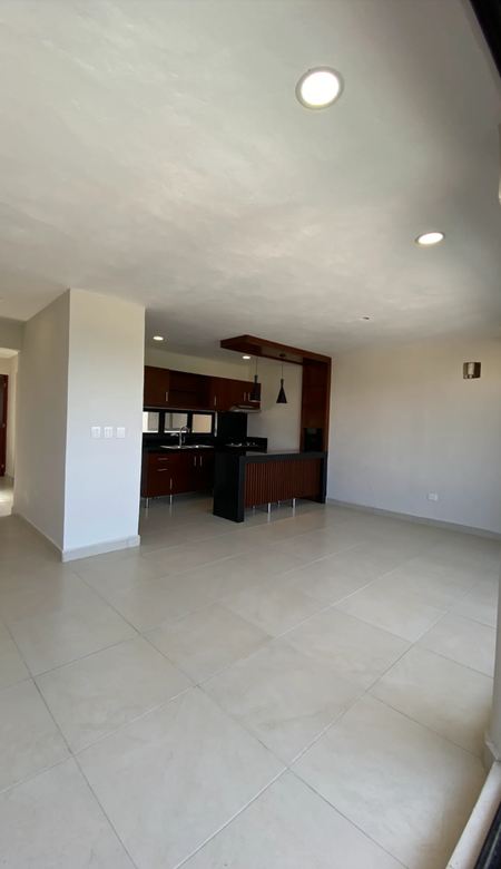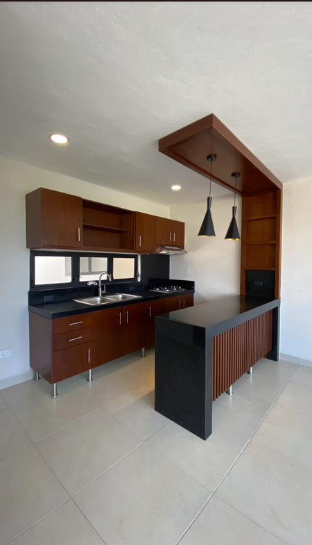 gabinetes inferiores y superiores de melamina tonos color madera Tzalam. Con barra con luces y lámparas decorativas Cocina incluye parrilla de gas instalada y campana extractora. Ventilación en cocina con ventana hacia cubo central de luz y aire.
