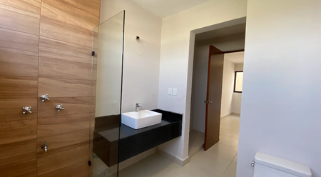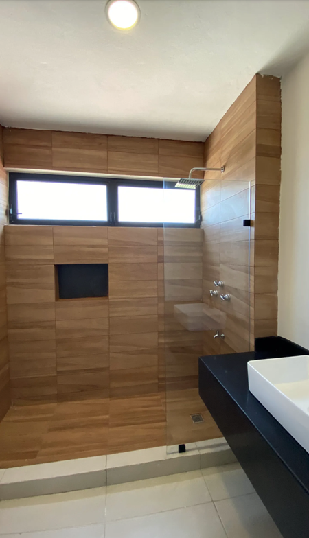 Recámara principal con área de closet vestidor y baño completo el cual Incluye cancel de vidrio templado y meseta en lavabo de granito en color negro San Gabriel.