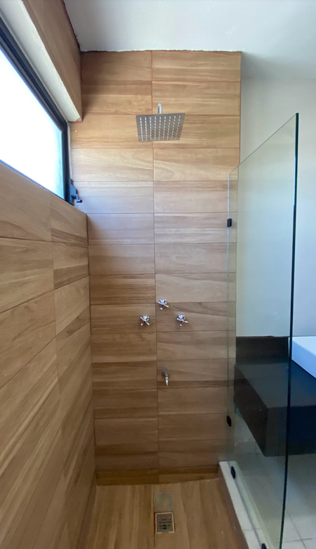 2do Baño completo para uso de visitas y recámara secundaria, con cristal templado para área de regadera y meseta en lavabo de granito en color negro San Gabriel