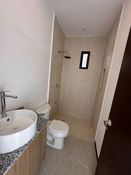 Un baño completo con nichos en el área húmeda para recámara secundaria/visitas
