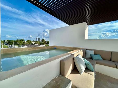 - Rooftop con Piscina, asador y mobiliario de exterior en área social (sala y mesas)
