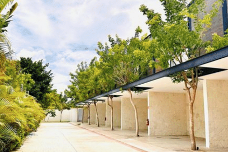 Los espacios al aire libre este proyecto, adornados con una vegetación que crece vigorosamente, constituyen el